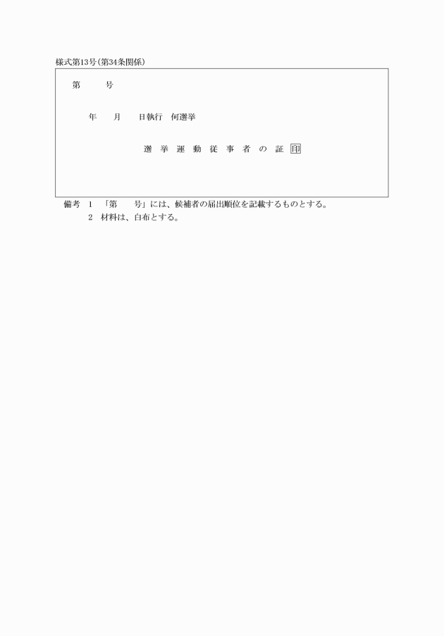 第15条 法第141条の2(自動車等の乗車制限)第2項の規定により、主として選挙運動のために使用される自動車又は船舶に乗車又は乗船をする者が着用する腕章は、様式第4号によるものとする。