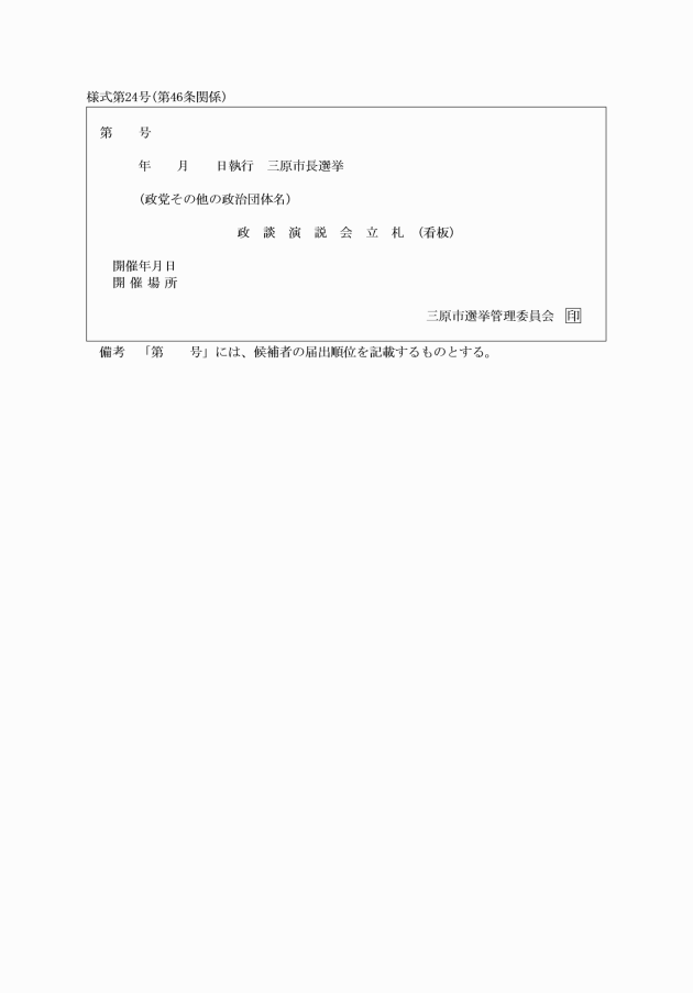 第24条 令第115条(個人演説会等の施設の管理者に対する通知)の規定により、選挙管理委員会が個人演説会等の施設(令第112条第2項に規定する個人演説会等の施設をいう。以下この章において同じ。)の管理者(以下「管理者」という。)に対して行う通知は、様式第8号による文書でこれを行う。
