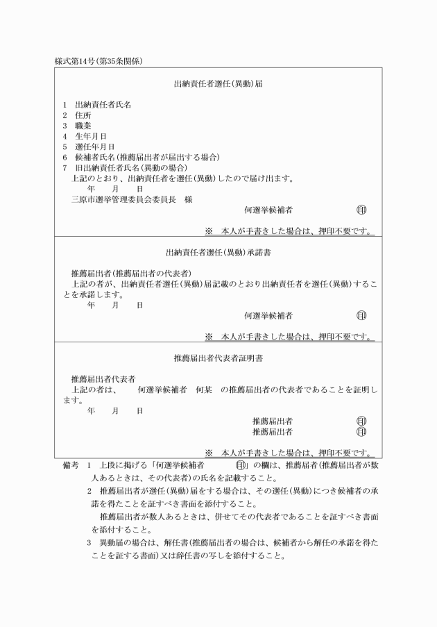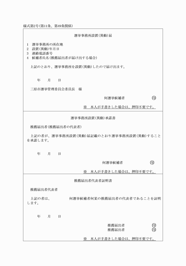 第11条 法第130条(選挙事務所の設置及び届出)第2項の規定による選挙事務所の設置及び異動の届出は、様式第2号によるものとする。