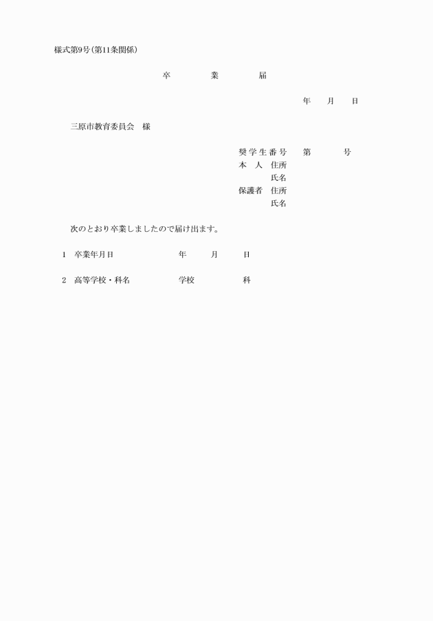 第14条 奨学生が卒業後、奨学金の返還完了前に死亡した場合は、保護者又は世帯主若しくは遺族は、保証人とともに、死亡を証する書面を添えて元奨学生死亡届(様式第13号)によって教育委員会に届け出なければならない。