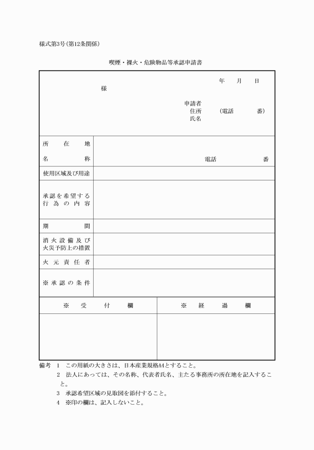第20条 条例第65条第1号から第6号までに掲げる火災とまぎらわしい煙等を発するおそれのある行為等の届出は、第1号にあっては火災とまぎらわしい煙又は火炎を発するおそれのある行為の届出書(様式第10号)により実施する日の前日までに、第2号については煙火打上げ・仕掛け届出書(様式第11号)、第3号については催物開催届出書(様式第12号)、第4号については水道断(減)水届出書(様式第13号)、第5号については道路工事・占用届出書(様式第14号)、第6号については露店等の開設届出書(様式第15号)により実施する日の3日前までに届け出なければならない。ただし、第1号、第4号及び第5号に係る届出については、やむを得ない場合は、口頭によることができる。