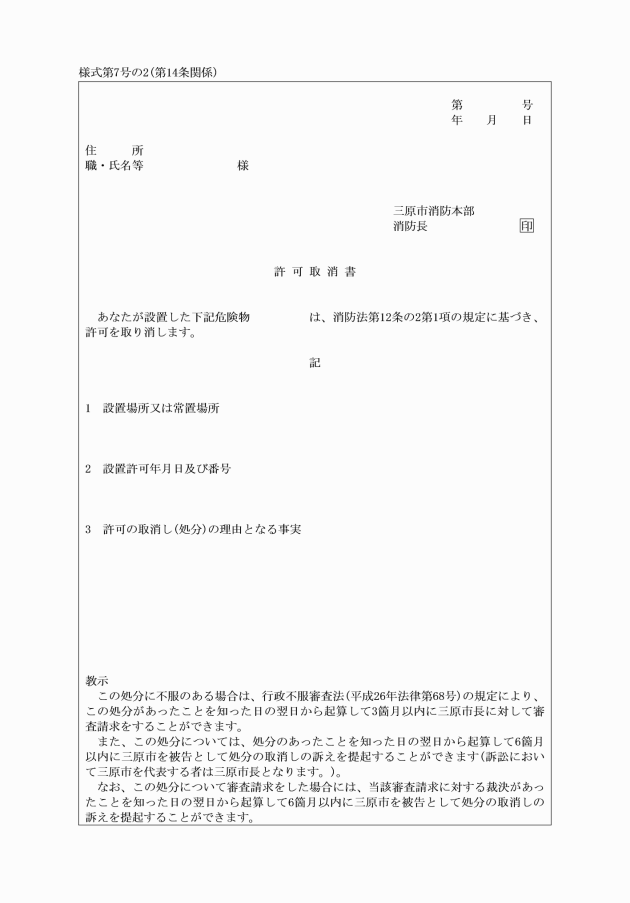 第22条 命令書、特例認定取消書、許可取消書、戒告書、代執行令書及び代執行費用納付命令書を交付する場合は、行政不服審査法(平成26年法律第68号)第82条第1項及び第2項に定める教示をしなければならない。