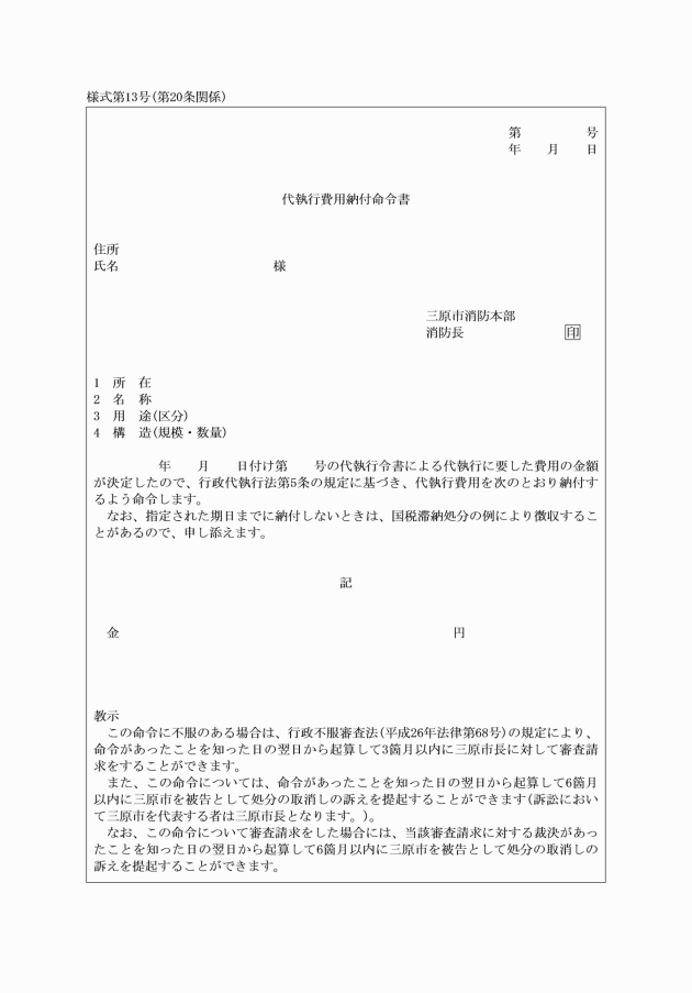(4) 代執行費用納付命令書(様式第13号)