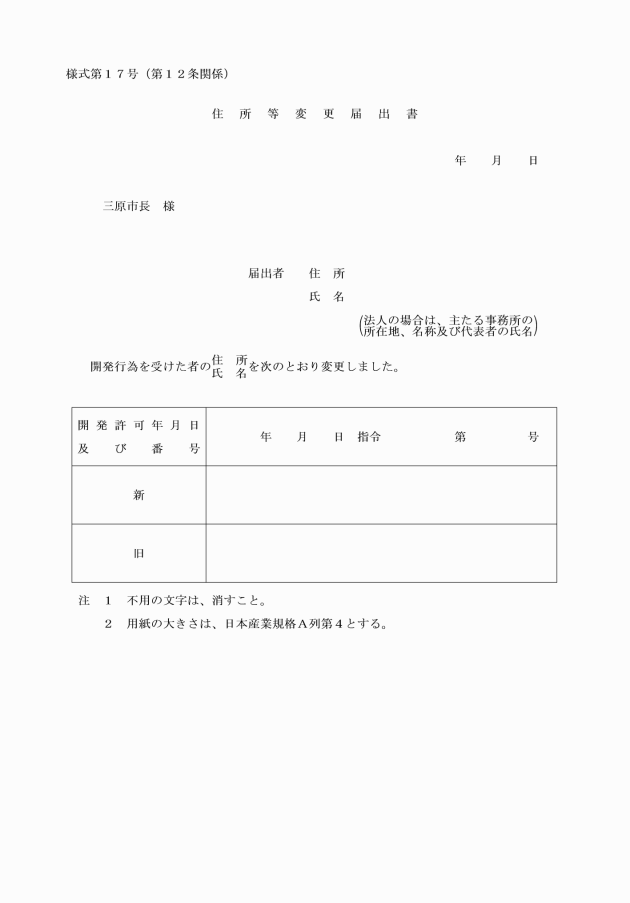 第12条 開発行為の許可を受けた者は、住所又は氏名若しくは名称に変更があったときは、住所等変更届出書(様式第17号)を市長に提出しなければならない。