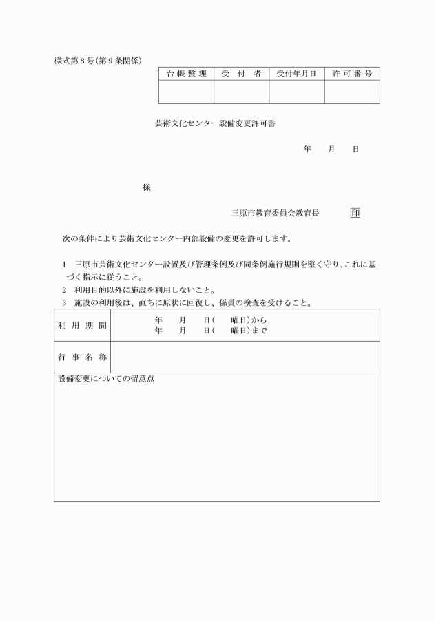 第9条 利用者は、芸術文化センターの施設若しくは附属設備の現状を変更し、又は特別の設備を設けようとするときは、芸術文化センター内部設備変更申請書(様式第7号)を教育長に提出し、その許可を受けなければならない。