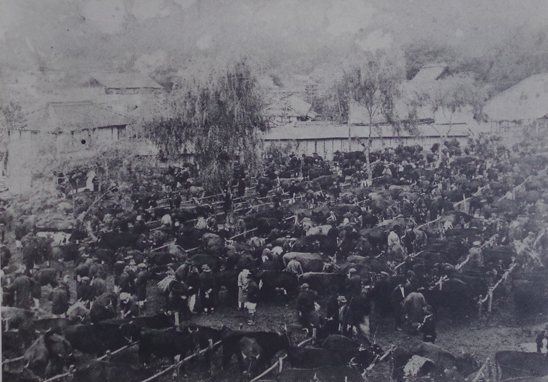 久井の牛馬市,全盛期の写真です。江戸時代には「日本三大牛馬市の一つ」とまでいわれ,その賑わいを彷彿させる写真です。