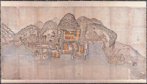 三原西町で酒造業などを営んでいた川口家に伝わったものです。 延宝2(1674)年創建の妙正寺が描かれており、元禄13(1700)年に築調された宮沖新開と東町の塩浜が描かれていないことから、この間の作成と考えられ、国会図書館の内閣文庫所蔵の正保絵図に次ぐ、古い三原城下の絵図です。