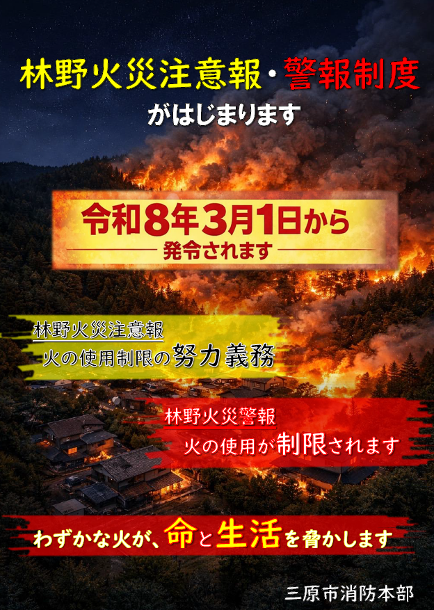 令和7年は3,370ヘクタールの山林が焼損した岩手県大船渡市の大規模林野火災をはじめ、全国各地で大規模な林野火災が相次いで発生しました。本年も全国各地で大規模な林野火災が発生しています。こうした状況を受け、三原市では火災予防条例を改正し、令和8年3月1日から林野火災の予防を目的とした「林野火災注意報」「林野火災警報」の運用を開始します。