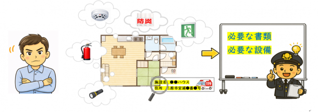 ※関係者が常駐しない宿泊施設については、万一火災や救急事案が発生した際には利用者が初期対応する必要がありますので、利用者の目の触れやすい場所に、施設の住所や名称の明示をお願いしています。