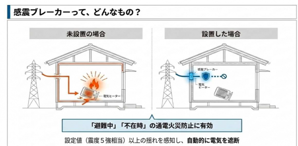 地震による電気火災を防ぐ、感震ブレーカーを設置しましょう。