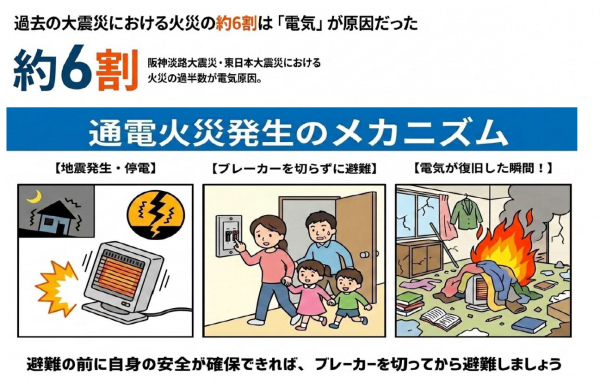 大きな地震のあとには、通電再開時などに電気火災が発生するおそれがあります。